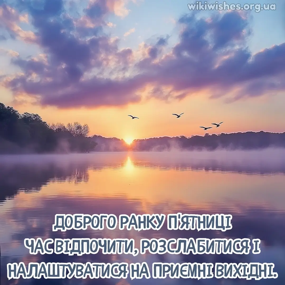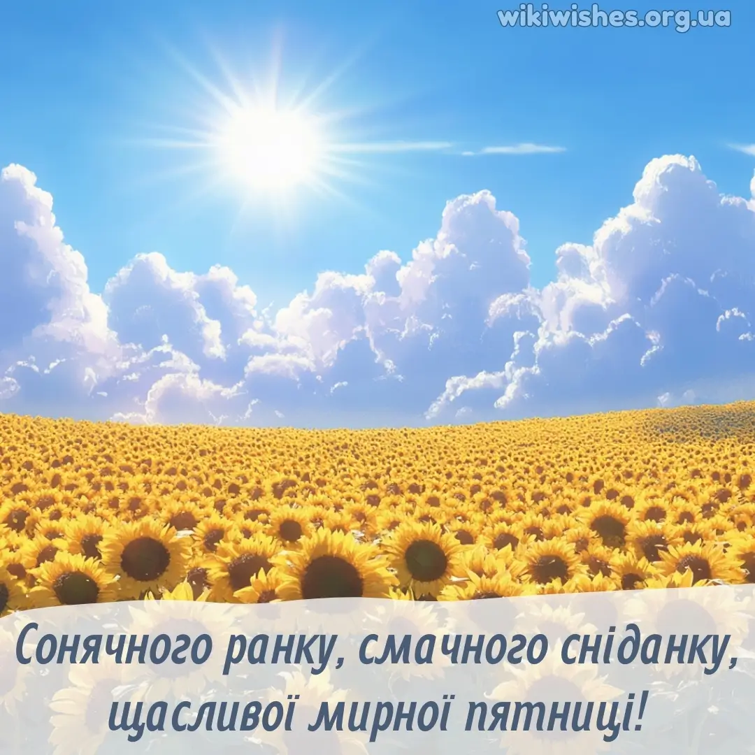 - Доброго ранку п’ятниці! Нехай цей день буде легким, наповненим позитивними емоціями та гарними новинами. Вже зовсім скоро — вихідні, тож тримайся, ти майже на фініші! 🌞